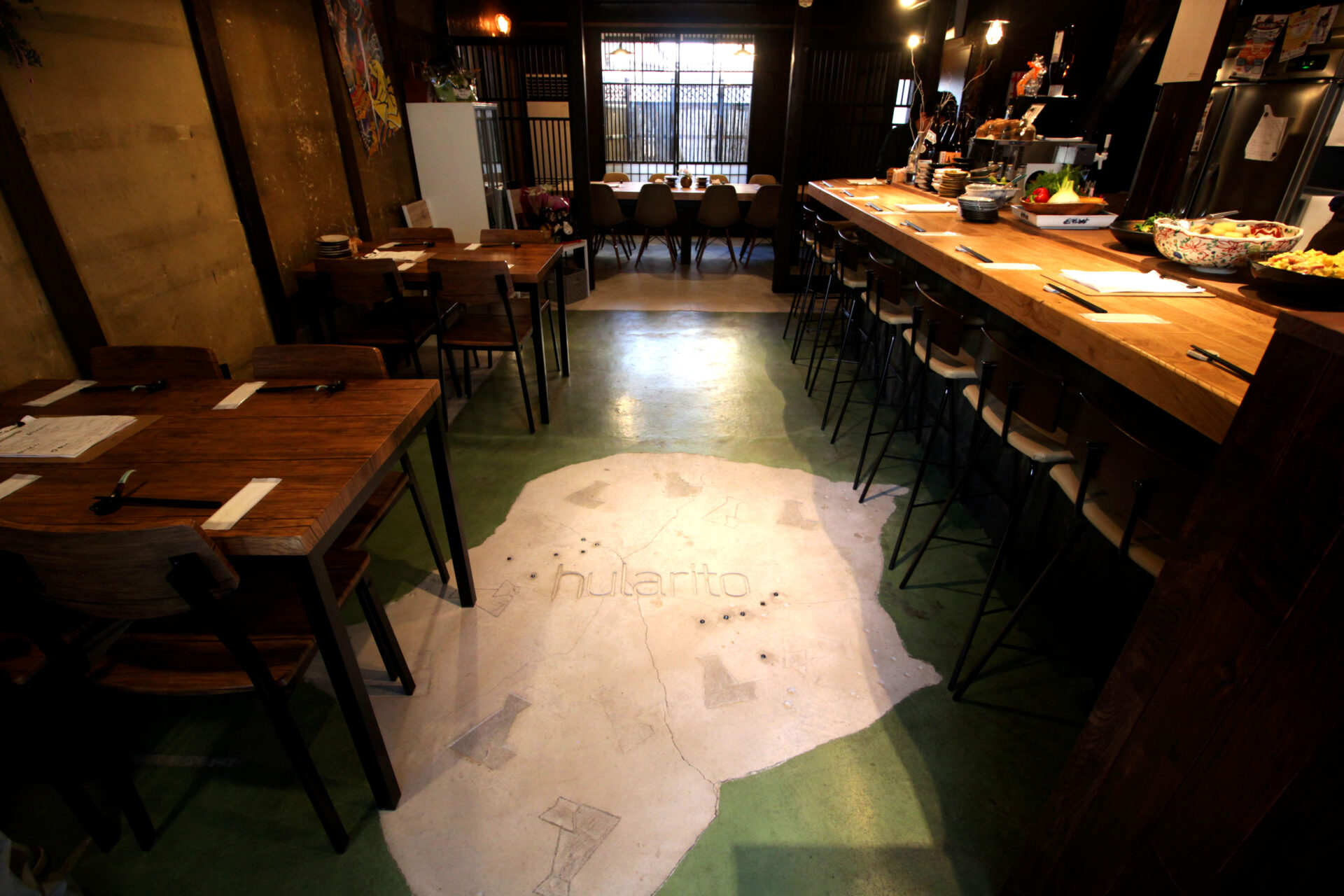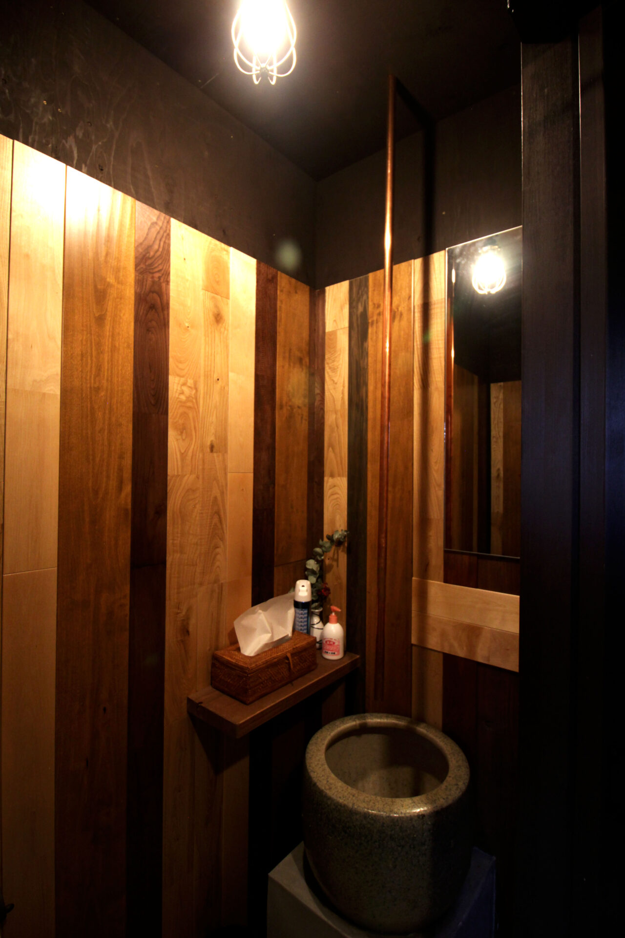 町屋の建築で歴史を感じる内外装の雰囲気をなるべく残し、最小限に手を加えるという手法でデザインを施しました。 壁の汚れや傷は敢えて残し、カウンターやトイレなど、最低限必要な部分のみを改修しました。
